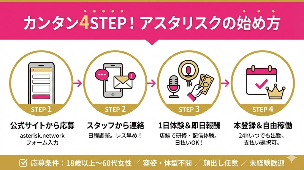 「チャットレディを長く続けるのは体力的に難しい…」という不安を解消するため、「チャットレディ → サポートスタッフ(正社員)→ エリアマネージャー(正社員)→ 独立開業」というキャリアアップ制度を設けています。将来の選択肢が広がる点も、アスタリスクが選ばれる理由の一つです。