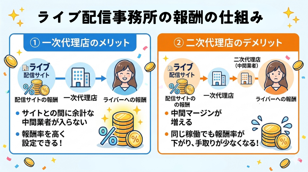 「一次代理店」であることの大きなメリットは、サイトとの間に余計な中間業者が入らないため、報酬率が高く設定できる点です。二次代理店以下になると中間マージンが増え、同じ稼働でも手取りが少なくなります。