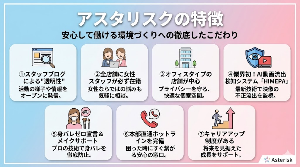 A. 安全性は業界トップクラスです。 アスタリスクはオフィスビル型の店舗設計で、マンション型と違い「出退勤が目立ちにくい」構造です。また、「身バレゼロ宣言」 を掲げており、ウィッグ・衣装・メイク支援のほか、AI動画流出検知システム「HIMEPA」も導入しています。さらに全スタッフの80〜90%が女性で、本部直通ホットラインも完備しています。
